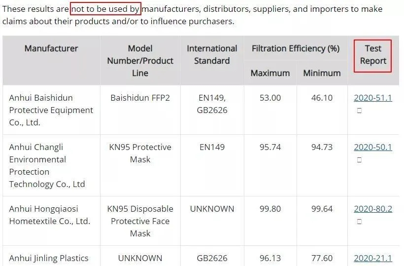 以下為美國CDC對中國口罩檢測結(jié)果部分截圖: