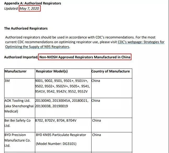 5月7日,美國FDA更新了針對中國生產(chǎn)的未獲NIOSH認(rèn)證的口罩獲得EUA授權(quán)的文件,獲得FDA認(rèn)可的中國生產(chǎn)的非NIOSH認(rèn)證的口罩只剩下14個廠家。