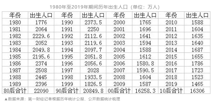 新生人口是母嬰行業(yè)基本盤中的基本盤。進入21世紀以來,這二十年間總共有多少人出生?隨著出生率逐年下降,00后和10后,相比80后和90后,究竟少了多少人?近日,第一財經(jīng)根據(jù)歷年統(tǒng)計公報、公開數(shù)據(jù)統(tǒng)計梳理發(fā)現(xiàn),我國80后、90后、00后、10后人數(shù)分別為2.21億、2.08億、1.63億(16258萬)、1.63億(16306萬)。