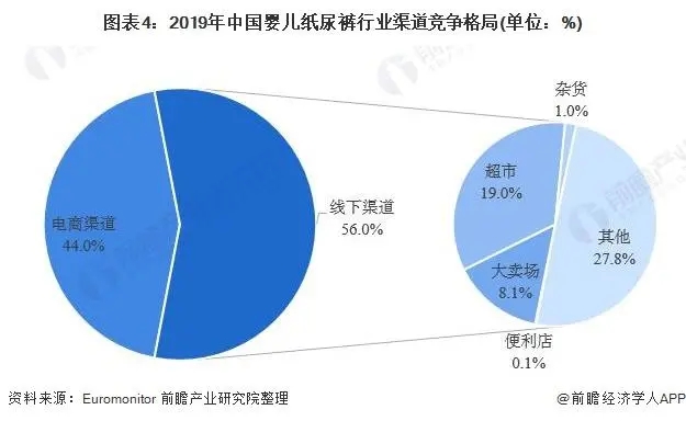 隨著互聯(lián)網(wǎng)以及網(wǎng)購(gòu)的流行,電商渠道的銷(xiāo)售占比不斷提升,嬰兒紙尿褲電商渠道銷(xiāo)售占比從2010年的4.8%迅速增長(zhǎng)至2019年的44%,而以超市、大賣(mài)場(chǎng)等為代表的線下渠道銷(xiāo)售額占比從2010年的95.2%減少至2019年的56%。