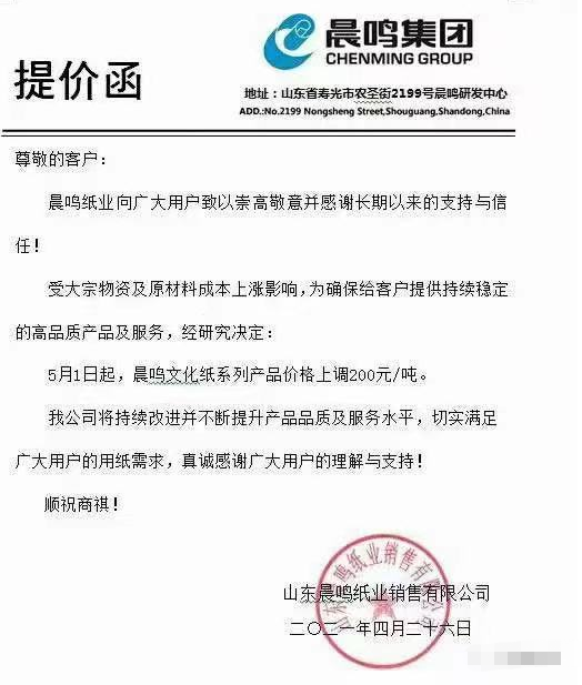 晨鳴紙業(yè):5月1日起,晨鳴銅版紙系列產(chǎn)品價(jià)格上調(diào)200元/噸。