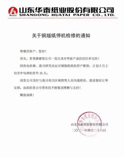 華泰紙業(yè):因熱點(diǎn)檢修,我司研究決定對銅版紙紙機(jī)停產(chǎn)維保,計(jì)劃5月上旬至中旬擇機(jī)停車10天。