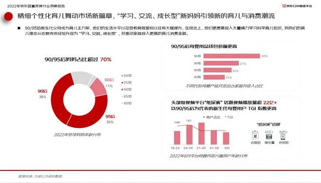 隨著90/95后新生代父母成為育兒主力軍,他們的生活水平以及受教育程度較以往有大幅提升,在觀念上,他們更愿意投入大量精力學習科學育兒知識,媽媽們的育兒理念從依賴傳統(tǒng)經(jīng)驗升級為“學習、交流、成長型”,并推動家庭投入更高的育兒消費金額。這些個性化的育兒方式也激活了市場新篇章,95后父母在母嬰用品的月支出占到了家庭月收入的30%。