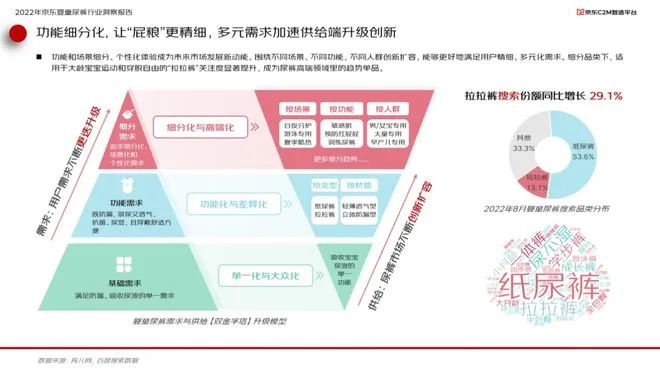 在產(chǎn)品細分賽道方面,功能和場景細分、個性化體驗成為未來市場發(fā)展新動能。圍繞不同場景、不同功能、不同人群創(chuàng)新擴容,能夠更好地滿足用戶精細、多元化的需求。細分品類下,適用于大齡寶寶運動和穿脫自由的“拉拉褲”關注度顯著提升,成為高端尿褲領域里的趨勢單品。報告顯示,2022年8月,“拉拉褲”關鍵詞搜索份額同比提升29.1%。讓“屁糧"更精細,多元需求加速供給端升級創(chuàng)新。