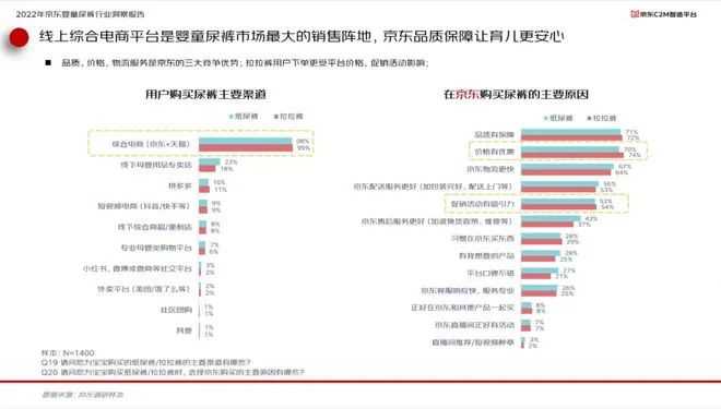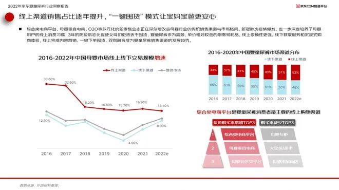 報告顯示,2022年中國嬰童尿褲市場渠道分布上,線上渠道占比已經(jīng)超過線下渠道達到52%,而以京東為代表的綜合類電商是嬰童尿褲消費者最主要的線上購物渠道。
