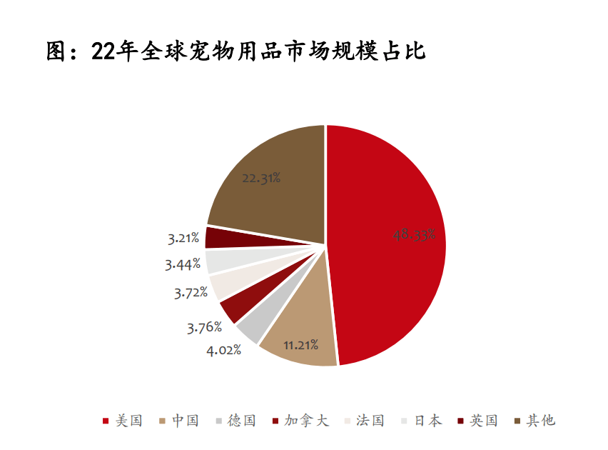 從國家層面來看,目前美國寵物用品市場規(guī)模排名第一,2022年美國寵物用品市場規(guī)模高達230.04億美元,占全球市場份額的48.33%。中國寵物用品市場規(guī)模僅次于美國,2022年市場規(guī)模為53.45億美元,占全球市場份額的11.21%;英國、德國、日本、法國、加拿大也是重要的寵物用品消費市場,根據歐睿國際的數(shù)據,22年德、加、法、日、英的寵物用品的市場份額分別為4.02%、3.76%、3.72%、3.44%、3.21%。