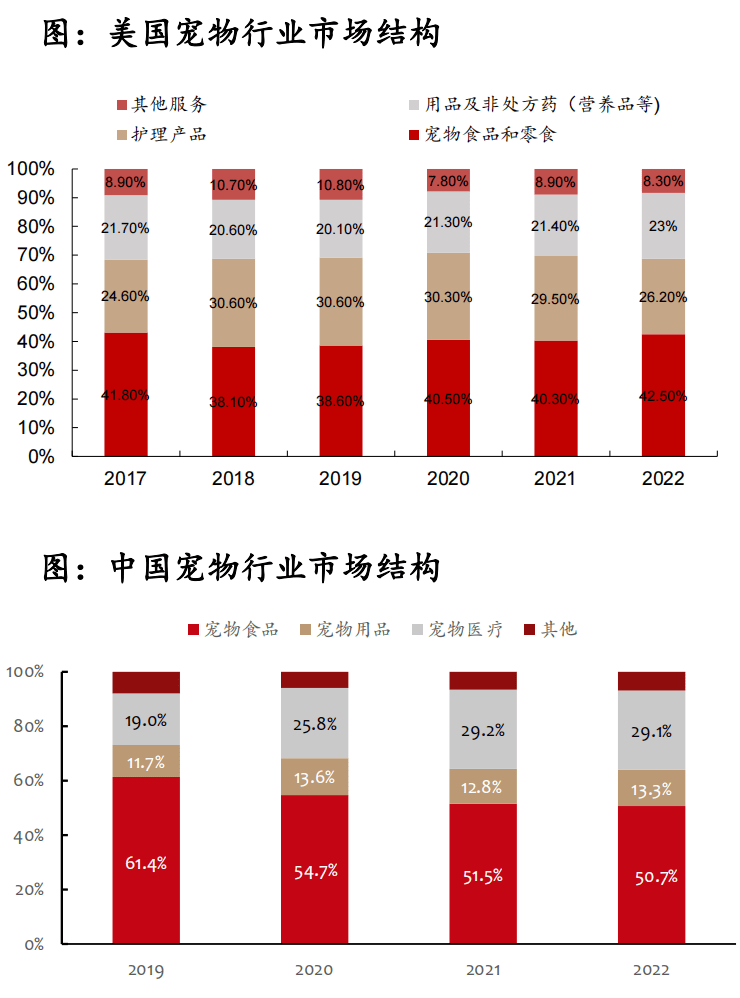 從寵物行業(yè)產業(yè)結構來看,根據APPA的數(shù)據,美國寵物用品、OTC藥品和活體動物市場規(guī)模占美國寵物行業(yè)總規(guī)模的比例平均約為22%,對標美國市場,目前中國寵物用品規(guī)模占比仍有很大的增長潛力與空間。