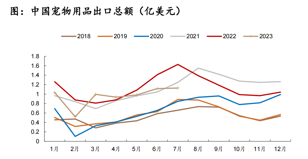 從寵物用品出口數(shù)據來看,目前我國寵物用品出口正在從底部回暖。2023年7月中國寵物用品以美元口徑計算出口總額為1.13億美元,同比減少30.64%,環(huán)比增長1.13%。