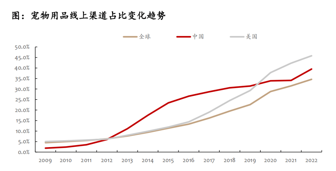 隨著電商平臺的迅猛發(fā)展以及線上購物的便捷性,寵物用品線下銷售渠道占比有所下降,而線上渠道占比持續(xù)提升。根據歐睿國際的數(shù)據顯示,全球寵物用品線上渠道占比由2013年的7.7%增長至2022年的34.6%,13-22年規(guī)模CAGR高達18.17%。