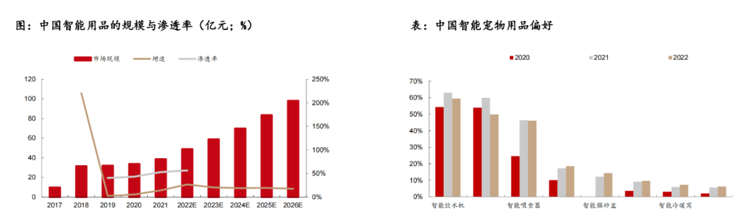 一是智能化:數(shù)據顯示,2017-2021年中國寵物用品市場規(guī)模分別為9.8、31.4、32.1、33.8、38.6億元,2017-2019年CAGR高達40.9%,預計到2026年,寵物智能用品有望達到98.1億元。
