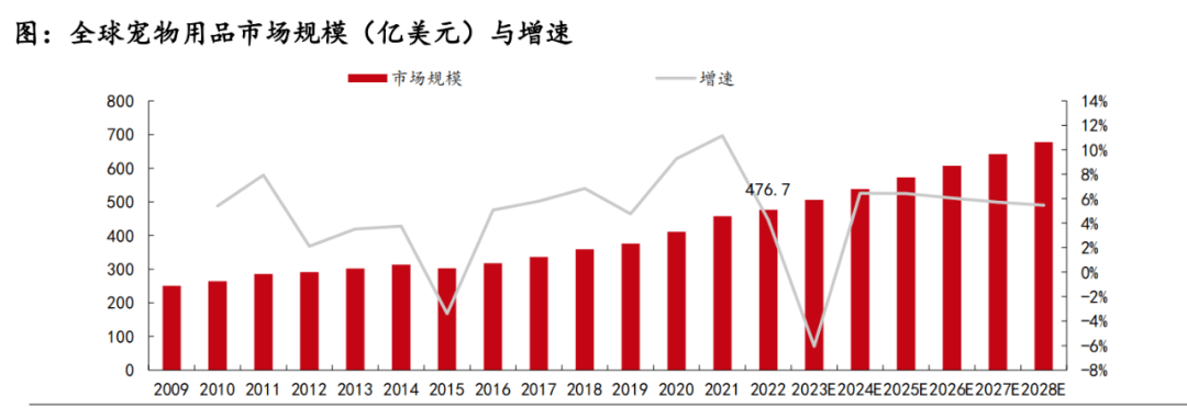 根據歐睿國際數(shù)據顯示,2019-2021年寵物用品市場增速分別為4.76%、9.28%、11.16%。2022年增速有所放緩,僅為4.28%,全球寵物用品規(guī)模達477.68億美元,2019-2022年復合增長率為8.20%,預計2022-2028年寵物用品復合年均增長率為3.03%,寵物用品市場規(guī)模將達到677.25億美元。