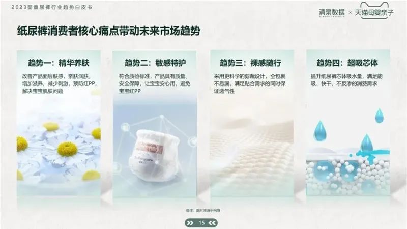 為解決6月齡內(nèi)新生兒的紅屁屁問題;1歲齡左右寶寶的側(cè)漏后漏問題;以及隨著寶寶年齡增長,對(duì)紙尿褲吸水量需求變大、紙尿褲表層潮濕等問題,有超過50%的消費(fèi)者表示,愿意為產(chǎn)品的特殊功能和成分升級(jí)支付更多費(fèi)用。延伸出了精華養(yǎng)膚、敏感特護(hù)、裸感隨行、超吸芯體四大趨勢。