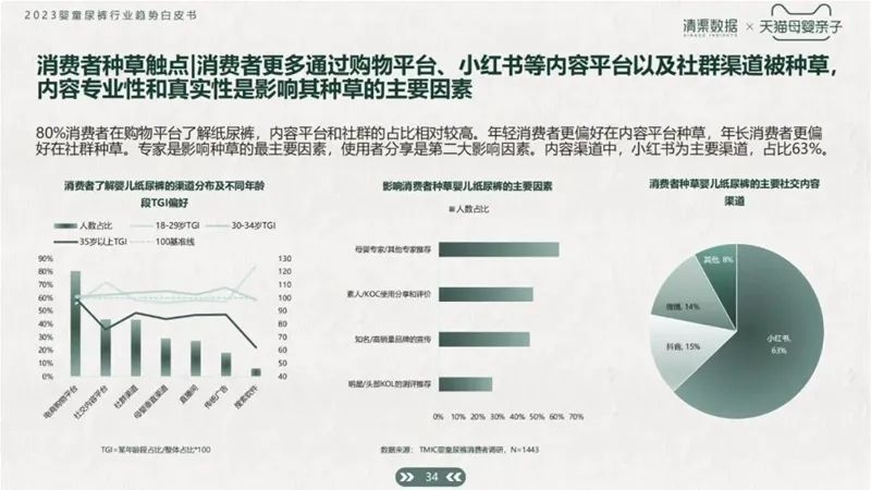 根據(jù)白皮書數(shù)據(jù)統(tǒng)計(jì),80%消費(fèi)者在購物平臺(tái)了解紙尿褲,內(nèi)容平臺(tái)和社群的占比相對(duì)較高。年輕消費(fèi)者更偏好在內(nèi)容平臺(tái)種草,年長消費(fèi)者更偏好在社群種草。專家是影響種草的最主要因素,使用者分享是第二大影響因素。內(nèi)容渠道中,小紅書為主要渠道,占比63%。