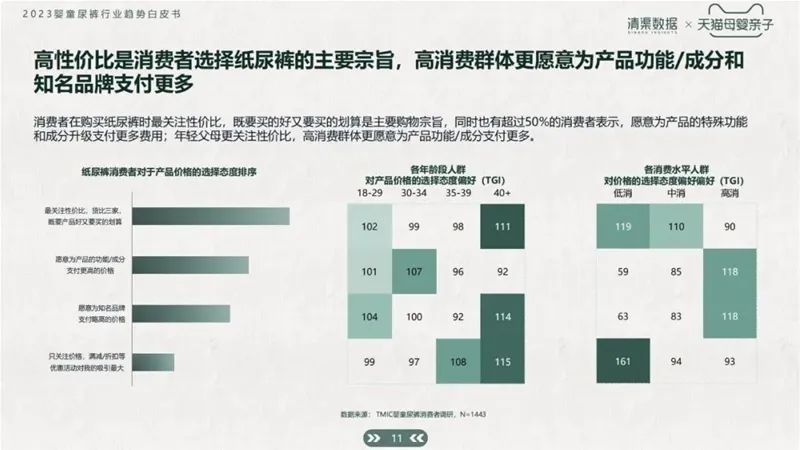 根據白皮書數據顯示,消費者在購買紙尿褲時最關注性價比,“又好又劃算”是主要購物宗旨,同時也有超過50%的消費者表示,愿意為產品的特殊功能和成分升級支付更多費用:年輕父母更關注性價比,高消費群體更愿意為產品功能/成分支付更多。